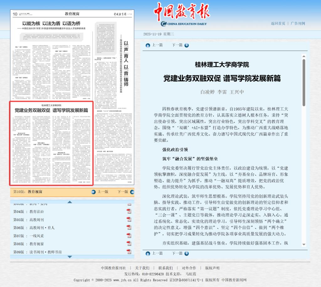 原文链接:http://paper.jyb.cn/zgjyb/html/2025-11/19/content_144749_19057390.htm四秩春秋育桃李,党建引领谱新章。自1985年建院以来,桂林理工大学商学院全面贯彻党的教育方针,认真落实立德树人根本任务,秉持“突出使命引领,突出区域属性,突出行业特色,突出学科交叉”的教育理念,围绕“‘双碳’+AI+东盟”打造办学特色,为推动广西重大战略落地实施、传承壮美广西优秀文化、奋力谱写中国式现代化广西篇章作出了重要贡...