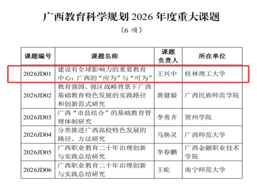 近日,广西教育科学规划领导小组公布了广西教育科学规划2026年度重大课题立项名单(桂教科学〔2025〕19号),我院王兴中教授申报的《建设有全球影响力的重要教育中心:广西的“应为”与“可为”》获批立项。该课题聚焦国家所需、广西所能、东盟所盼,梳理全球教育中心演进规律和其与科技中心、人才中心演化的互动机制,分析广西在支撑教育中心功能建设所需的对外开放能力、制度供给能力、国际规则对接能力、教育资源集聚与外溢...