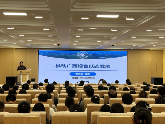讲座中,曾鸿鹄教授结合自身丰富的工作经验和丰硕的研究成果,从“政策背景与国家战略”“绿色低碳概念与路径”“广西绿色低碳发展概况”“我校学科专业及其贡献”四个方面,全面介绍了环境科学与工程学院在推动广西绿色低碳发展做出的努力和取得的成绩,以及对于广西绿色低碳发展未来走向的思考。曾鸿鹄教授指出,学科建设必须从产业实践中寻找真问题,按照“治理-管理-法理”的思路进行梯级式顶层设计,通过组建学科团队,真抓实干,从不同层面攻克难题,推动理论积累,提出能够引导产业健康发展高质量发展的解决方案,制定相应的政策法规体系,为谱写中国式现代化广西篇章、共建“一带一路”人类命运共同体做出贡献。