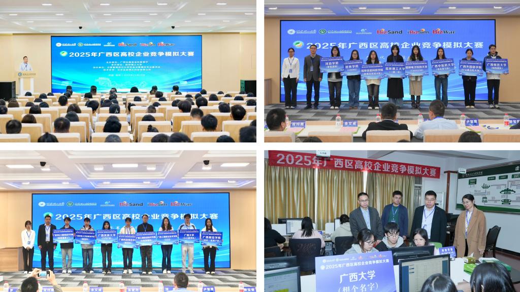 11月23日,由自治区教育厅主办、桂林理工大学商学院承办、中国管理现代化研究会决策模拟专业委员会协办的2025年广西区高校企业竞争模拟大赛在我校屏风校区举行。来自全区24所高校的79支队伍、200余名师生齐聚桂工,共同上演了一场精彩的商业智慧比拼。