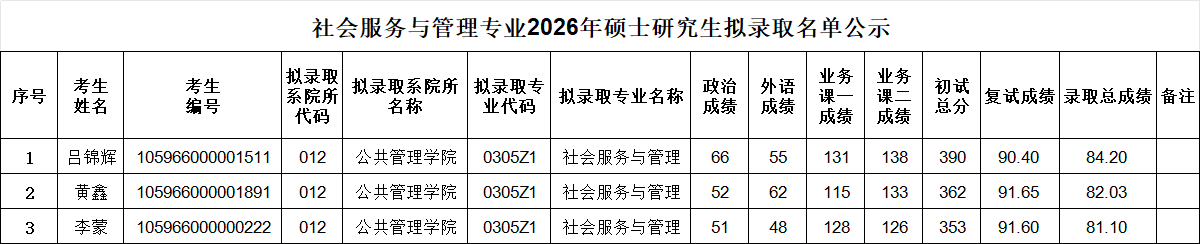 根据《2026年全国硕士研究生招生工作管理规定》及教育部相关文件规定,现对我院社会服务与管理专业2026年硕士研究生拟录取名单进行公示,公示期:2026年3月28日至4月4日。有异议者,请在公示期内以书面形式,并署真实姓名和联系电话,向我院纪委或我院办公室反映,不署真实姓名的,不予受理。联系电话:0773-5892136(纪委),0773-5892355(办公室),电子邮箱:duxingfa2015@163.com。公示名单如下: