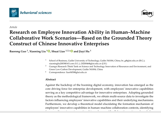 桂林理工大学商学院郭宝荣正高级工程师和桂林理工大学商学院副研究员廖帅、桂林理工大学商学院教师胡嘉议、桂林理工大学商学院研究生刘小宁合作完成的论文《Research on Employee Innovation Ability in Human–Machine Collaborative Work Scenarios—Based on the Grounded Theory Construct of Chinese Innovative Enterprises》于2025年6月发表在《Behavioral Sciences》。