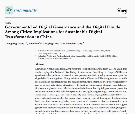 桂林理工大学商学院教授章昌平、桂林理工大学研究生吴帅、桂林理工大学研究生董莹莹合作完成的论文《Government-Led Digital Governance and the Digital Divide Among Cities: Implications for Sustainable Digital
