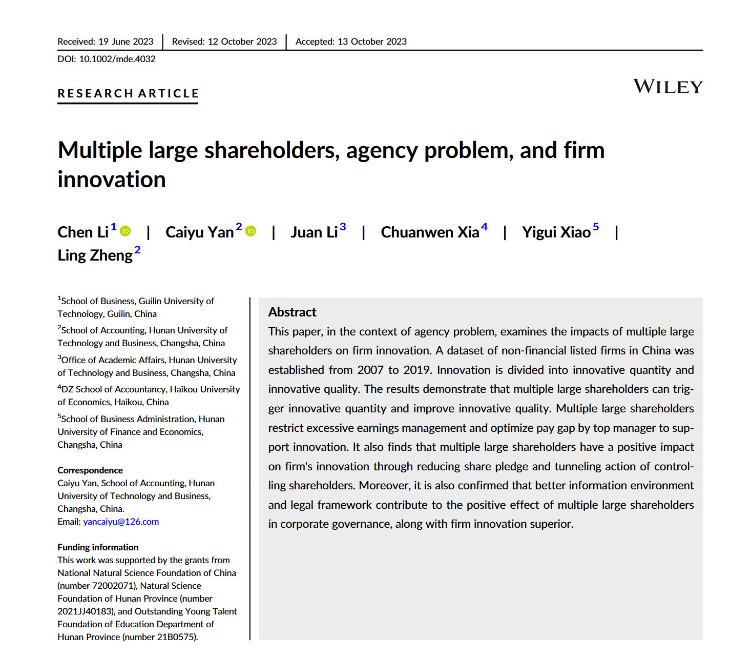 桂林理工大学商学院李琛教师与Caiyu Yan、Juan Li、Chuanwen Xia、Yigui Xiao、Ling Zheng合作完成的论文《Multiple large shareholders, agency problem, and firm innovation》于2024年10月13日发表在《Managerial and Decision Economics》第45卷第2期。