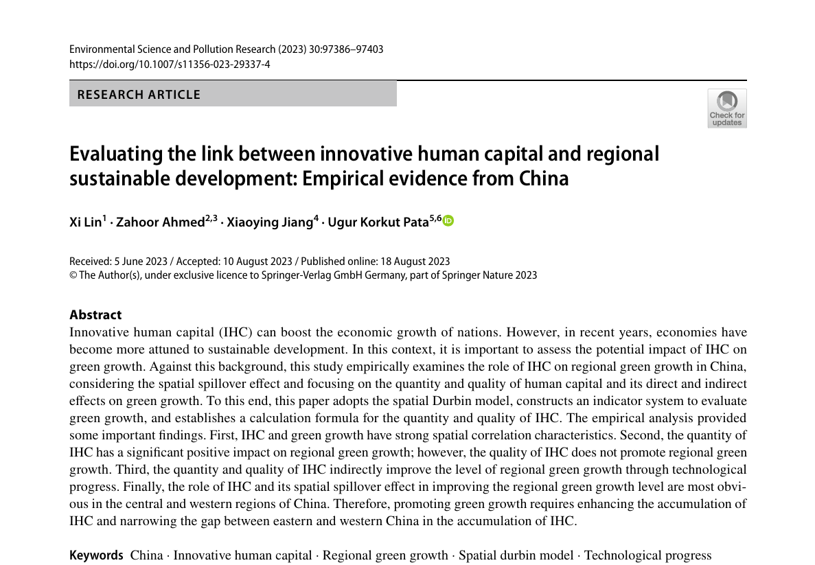 桂林理工大学商学院教师林西和蒋小瑛教师与Ahmed, Zahoor、Ugur Korkut Pata合作完成的论文《Evaluating the link between innovative human capital and regional sustainable development: empirical evidence from China》于2023年8月18日发表在《Environmental Science and Pollution Research》第30卷第43期。