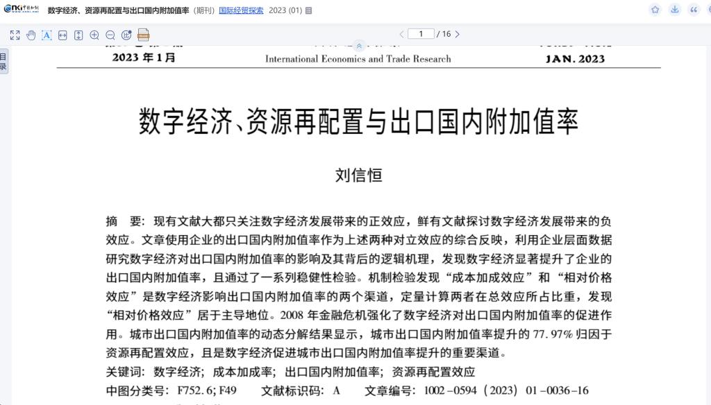 桂林理工大学商学院副教授刘信恒完成的论文《数字经济、资源再配置与出口国内附加值率》于2023年1月发表在《国际经贸探索》。