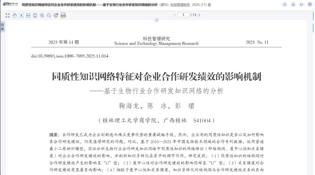 桂林理工大学商学院教授鞠海龙与桂林理工大学商学院副教授李彦庆、桂林理工大学商学院实验师彭珺、桂林理工大学商学院硕士研究生陈冰合作完成的论文《同质性知识网络特征对合作研发绩效的影响研究—— 基于生物行业的专利分析》于2025年6月发表在《科技管理研究》。