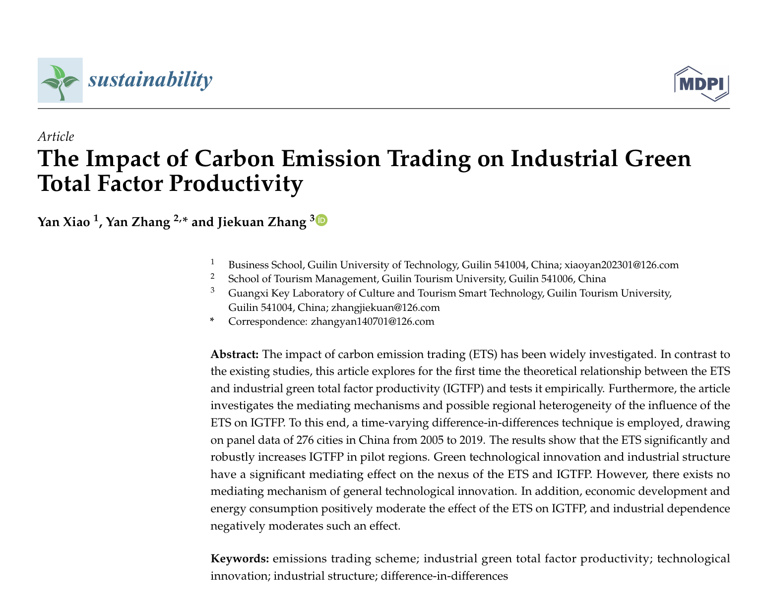 桂林理工大学商学院肖彦团队合作完成的论文《The Impact of Carbon Emission Trading on Industrial Green Total Factor Productivity》于2023年3月发表在《Sustainability》。