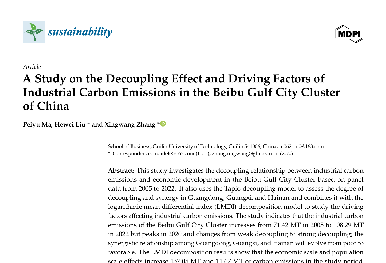 桂林理工大学商学院副教授刘河伟与桂林理工大学商学院教授张兴旺、桂林理工大学商学院硕士研究生马培育合作完成的论文《A Study on the Decoupling Effect and Driving Factors of Industrial Carbon Emissions in the Beibu Gulf City Cluster of China》于2025年4月发表在《Sustainability》。