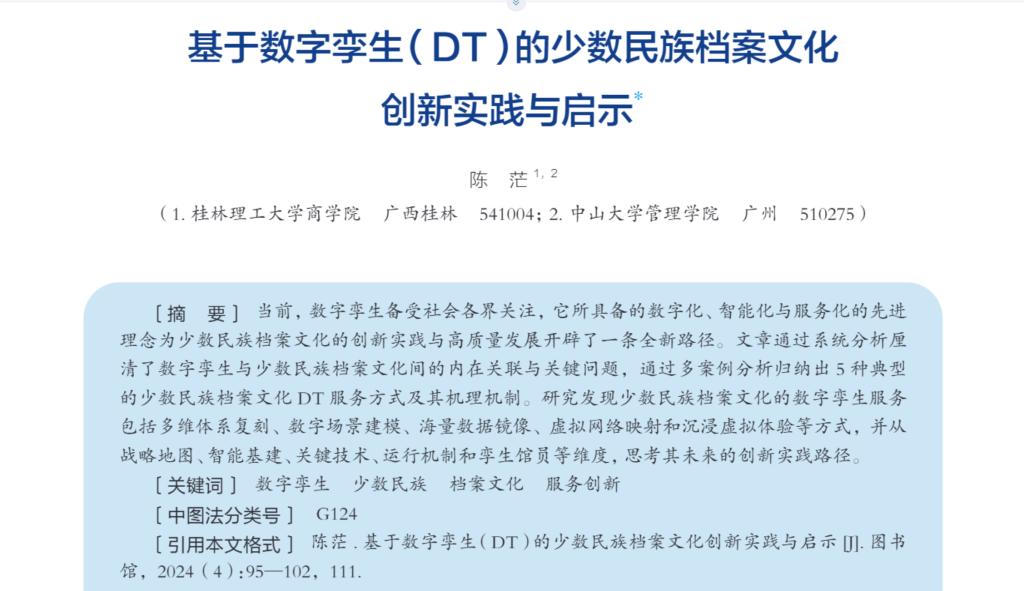 桂林理工大学商学院陈茫教授撰写的论文《基于数字孪生(DT)的少数民族档案文化创新实践与启示》,已正式于2024年4月15日发表于《图书馆》2024 年第 4 期。
