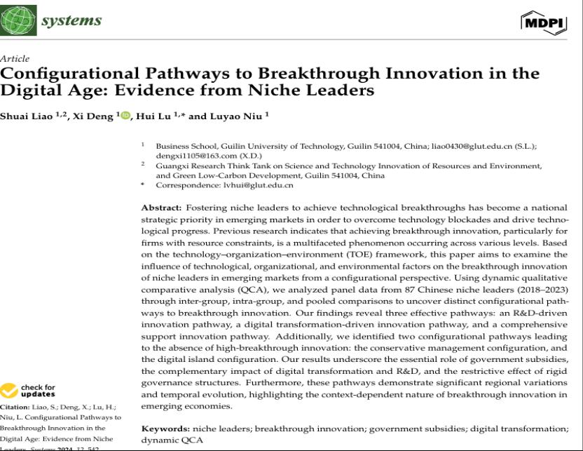 桂林理工大学商学院副研究员廖帅与桂林理工大学商学院副教授李卉、桂林理工大学商学院硕士研究生宋邓茜、桂林理工大学商学院硕士研究生牛璐瑶合作完成的论文《Configurational Pathways to Breakthrough Innovation in the Digital Age: Evidence from Niche Leaders》于2024年12月发表在《Systems》。