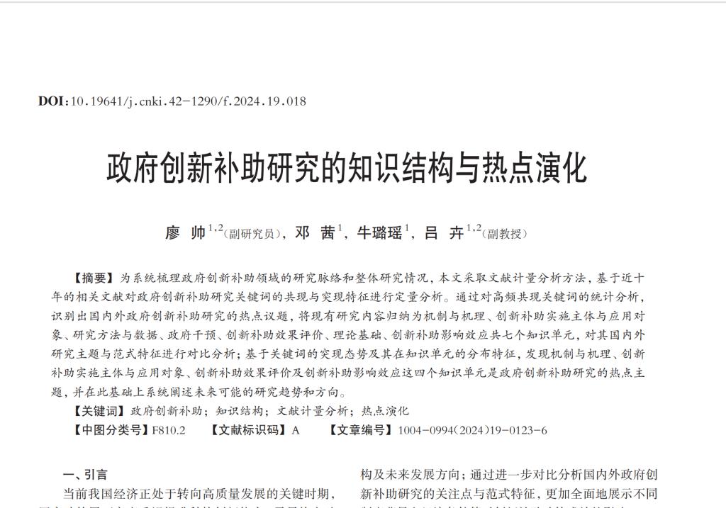 桂林理工大学廖帅副研究员与桂林理工大学商学院硕士研究生邓茜、桂林理工大学商学院硕士研究生牛璐瑶、桂林理工大学商学院副教授吕卉合作完成的论文“政府创新补助研究的知识结构与热点演化”于2024年10月发表在《财会月刊》。
