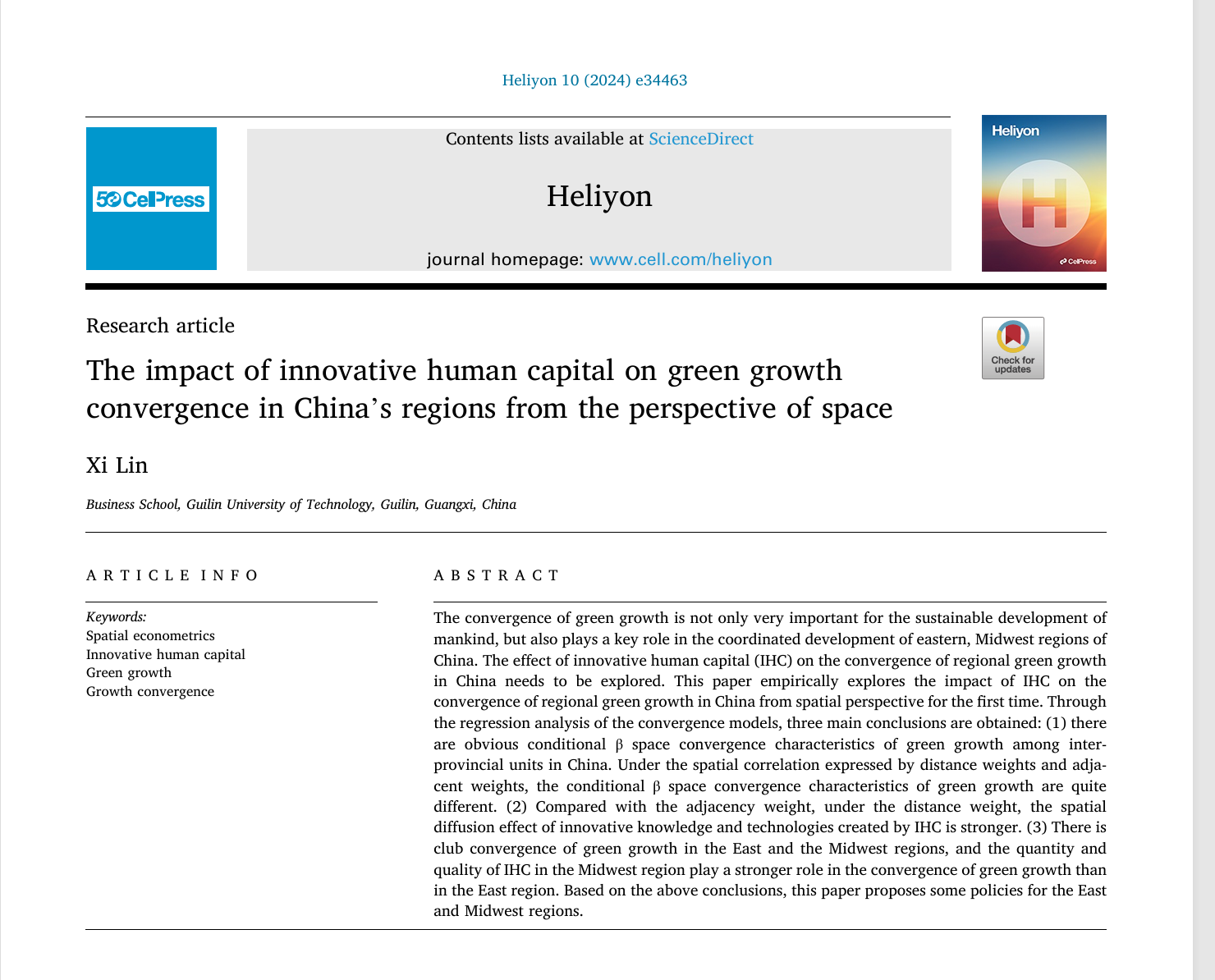 桂林理工大学教师林西完成的论文“创新人力资本对中国地区绿色增长融合的影响,从空间视角看”于2024年10月发表在《Heliyon》。