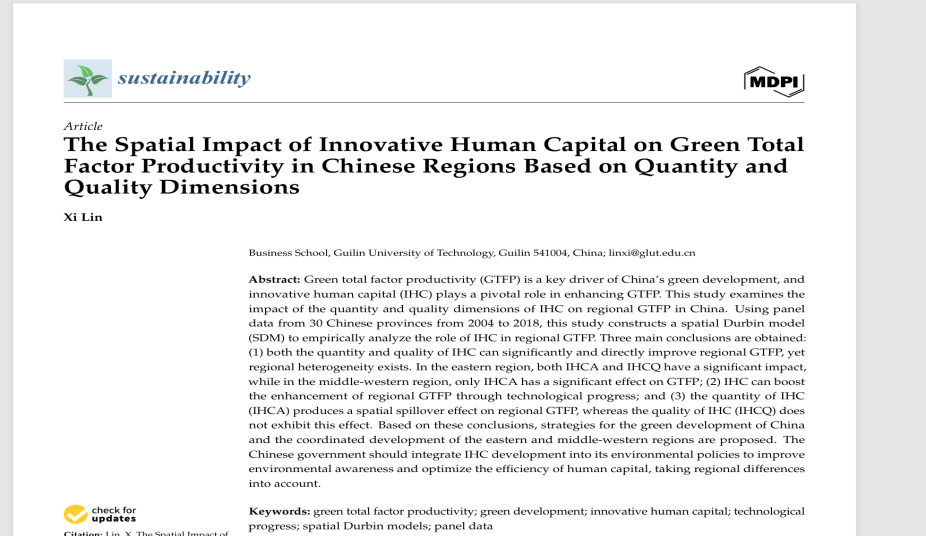 桂林理工大学林西教师完成的论文“创新人力资本对中国地区绿色总要素生产率的空间影响,基于数量和质量维度”于2024年10月发表在《Sustainability》。