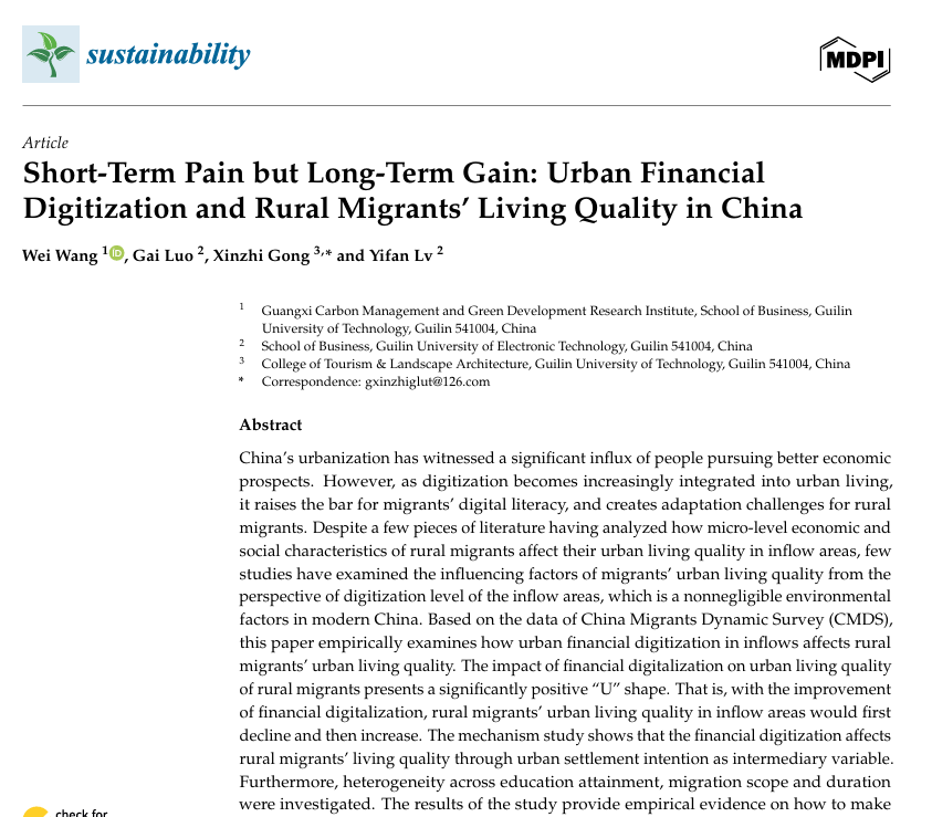 桂林理工大学商学院副教授王伟、桂林理工大学旅游与风景学院副教授巩新枝、桂林电子科技大学博士研究生吕伊凡、桂林电子科技大学罗盖合作完成的论文《Short-Term Pain but Long-Term Gain: Urban Financial Digitization and Rural Migrants’ Living Quality in China》于2025年9月发表于《Sustainability》。