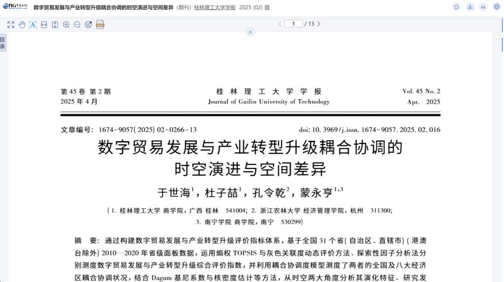 桂林理工大学商学院教授于世海与桂林理工大学商学院硕士研究生杜子喆、浙江农林大学孔令乾、南宁学院蒙永亨合作完成的论文《数字贸易发展与产业转型升级耦合协调的时空演进与空间差异》于2025年4月发表在《桂林理工大学学报》。 原文出处:于世海,杜子喆,孔令乾,等.数字贸易发展与产业转型升级耦合协调的时空演进与空间差异[J].桂林理工大学学报,2025,45(02):266-278.