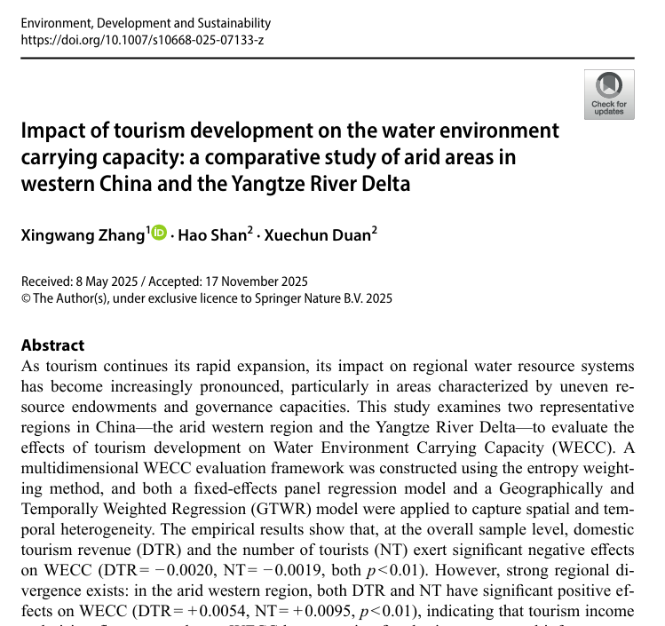 桂林理工大学商学院教授张兴旺、桂林理工大学商学院研究生单昊、桂林理工大学商学院研究生段雪纯合作完成的论文《Impact of tourism development on the water environment carrying capacity: a comparative study of arid areas in western China and the Yangtze River Delta》于2025年12月发表在《Environment, Development and Sustainability》。