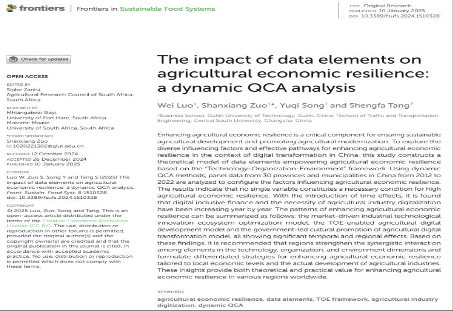 桂林理工大学商学院教授罗薇与桂林理工大学商学院硕士研究生宋钰祺、桂林理工大学商学院硕士研究生左珊湘合作完成的论文《The impact of data elements on agricultural economic resilience: a dynamic QCA analysis》于2025年1月发表在《Front. Sustain. Food Syst.》。