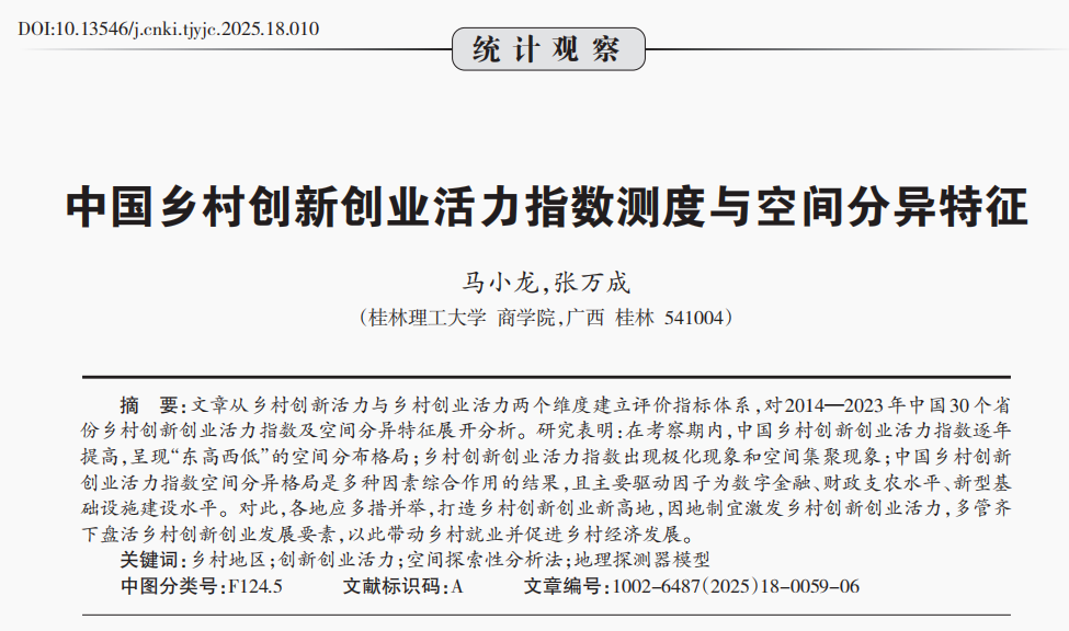 桂林理工大学商学院教授马小龙与桂林理工大学商学院研究生张万成合作完成的《中国乡村创新创业活力指数测度与空间分异特征》于2025年9月发表于《统计观察》 原文出处:马小龙,张万成. 中国乡村创新创业活力指数测度与空间分异特征 [J]. 统计与决策, 2025, 41 (18): 59-64. DOI:10.13546/j.cnki.tjyjc.2025.18.010.