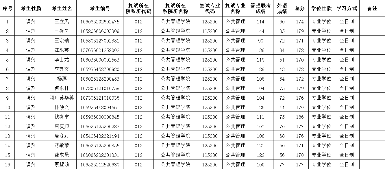 公共管理专业(MPA,代码125200)2026年调剂考生复试名单公示