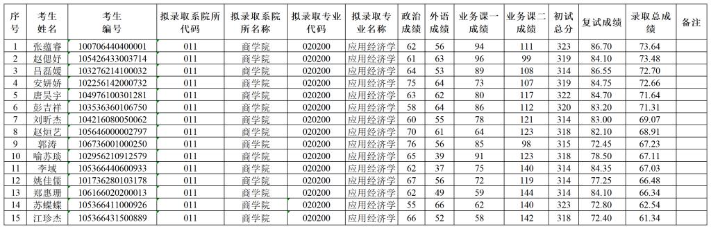 应用经济学专业2026年硕士研究生拟录取名单(调剂考生)