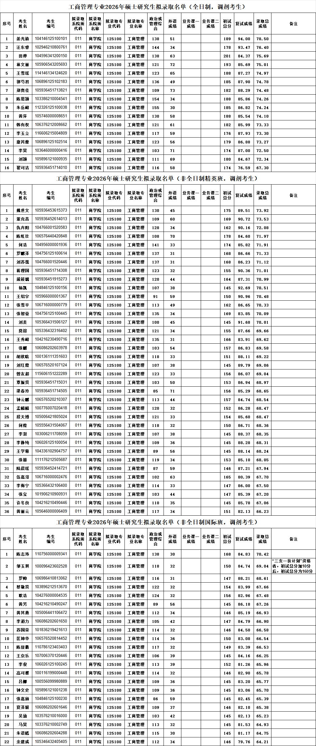 工商管理专业2026年硕士研究生拟录取名单公示(调剂考生)