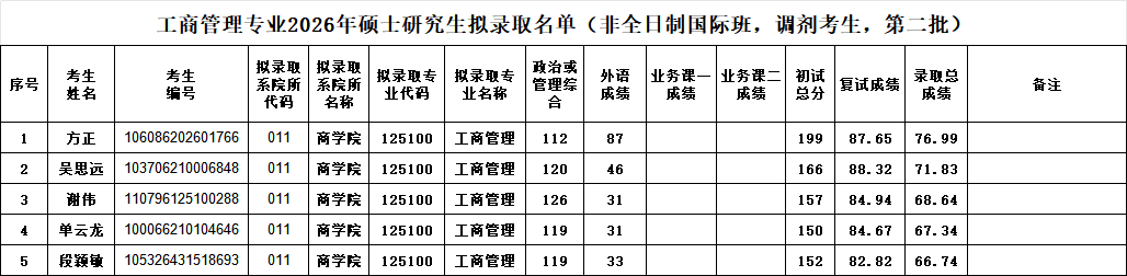 根据《2026年全国硕士研究生招生工作管理规定》及教育部相关文件规定,现对我院工商管理专业2026年硕士研究生拟录取名单(调剂考生,第二批)进行公示,公示期:2026年4月16日至4月22日。有异议者,请在公示期内以书面形式,并署真实姓名和联系电话,向我院纪委或我院办公室反映,不署真实姓名的,不予受理。联系电话:0773-5892136(纪委),0773-5892355(办公室),电子邮箱:duxingfa2015@163.com。公示名单如下:
