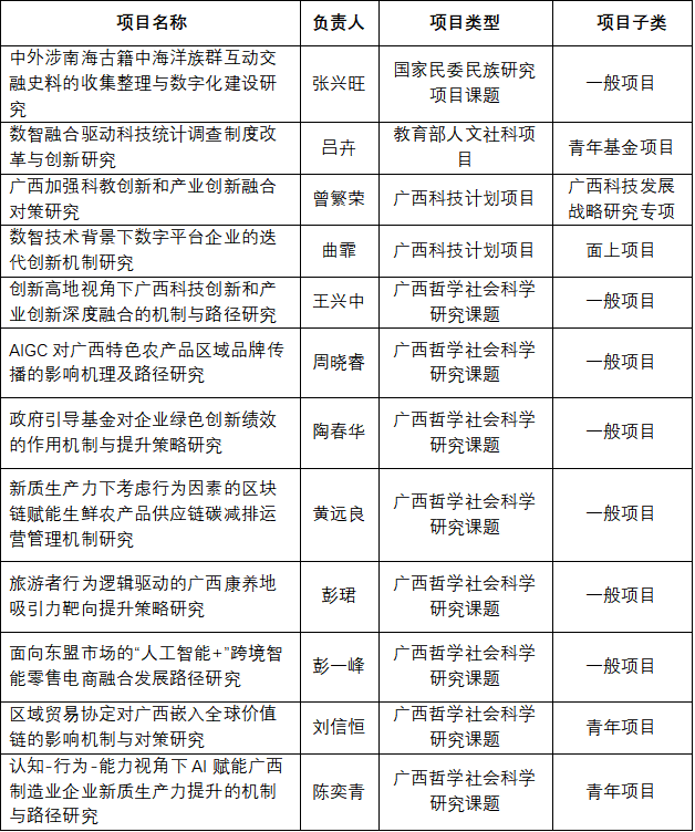 近日,广西壮族自治区哲学社会科学工作办公室、国家民委科研项目管理办公室、教育部社会科学司等部门正式公布了2025年度项目的立项名单,我院共有10位教师申报的课题获批立项。其中张兴旺老师申报的《中外涉南海古籍中海洋族群互动交融史料的收集整理与数字化建设研究》获得国家民委民族研究项目课题一般项目立项;吕卉老师申报的《数智融合驱动科技统计调查制度改革与创新研究》获得教育部人文社科项目青年基金项目立项;王兴...
